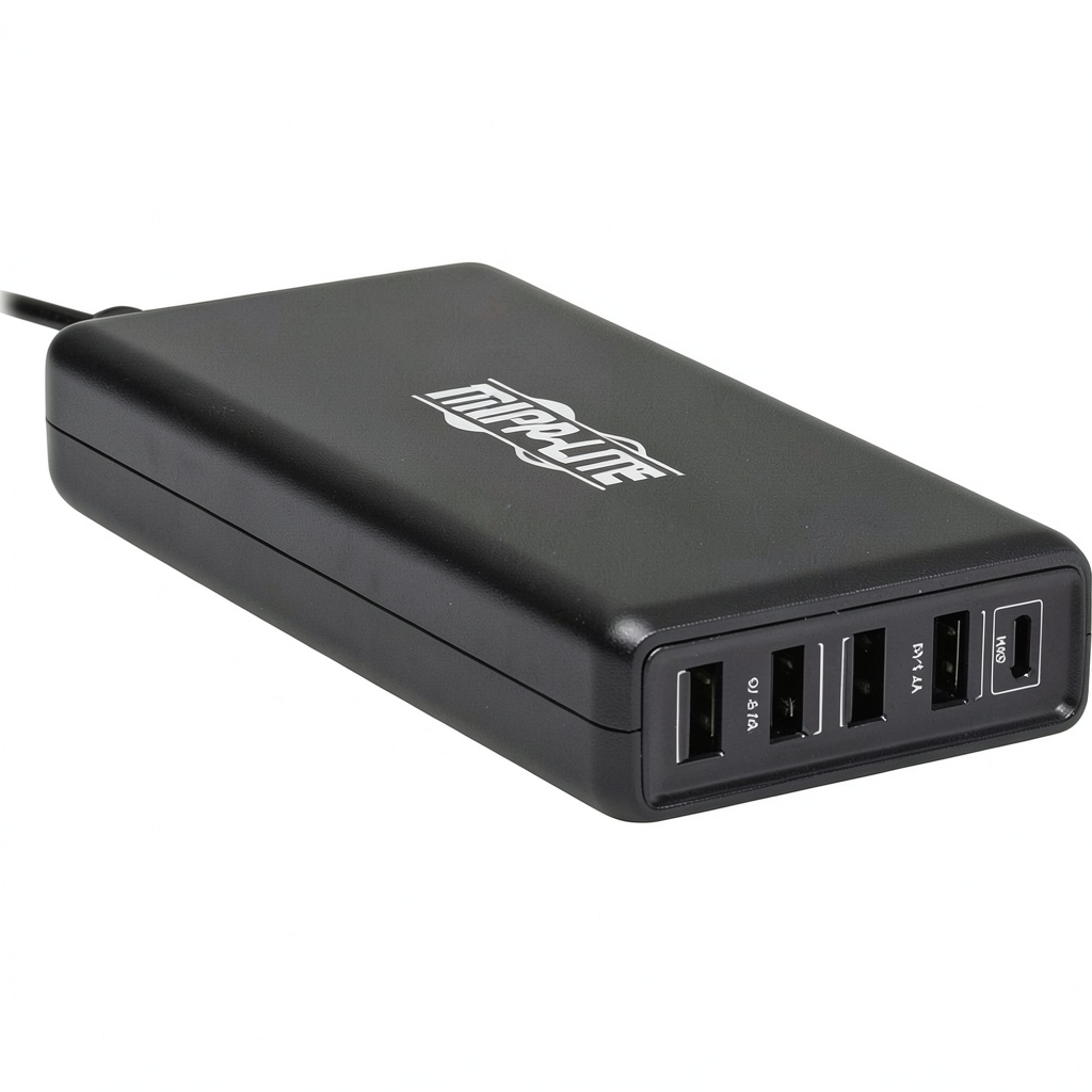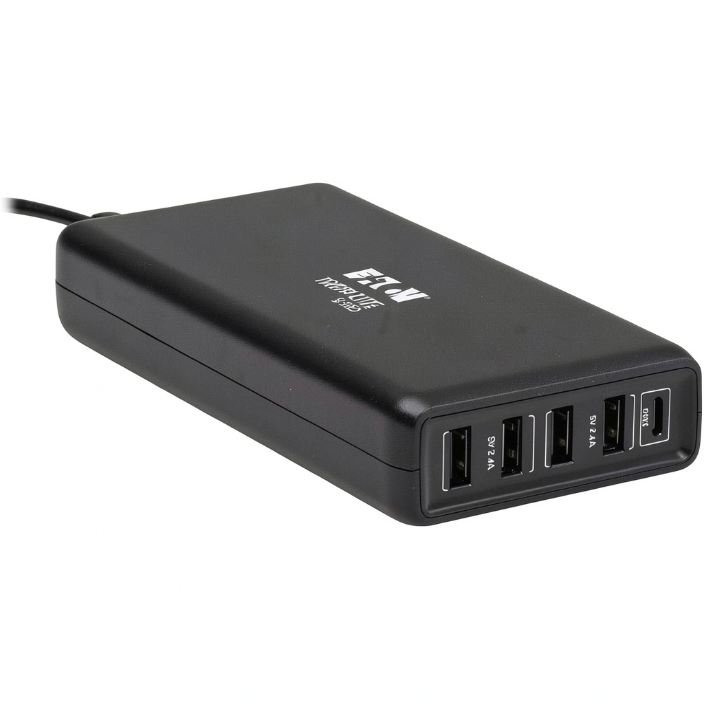 The Eaton Tripp Lite USB Charging Station is a high-performance solution for charging multiple devices simultaneously. With a total power output of 110W, it includes one USB-C Power Delivery (PD) port capable of delivering up to 86W and four USB-A ports compliant with BC 1.2 standards, each providing up to 12W. This charger is USB-IF certified, ensuring it meets rigorous industry standards for safety, efficiency, and compatibility. Built with auto-sensing technology, it automatically adjusts power levels to optimize charging for connected devices, making it suitable for a wide range of electronics from smartphones to laptops.